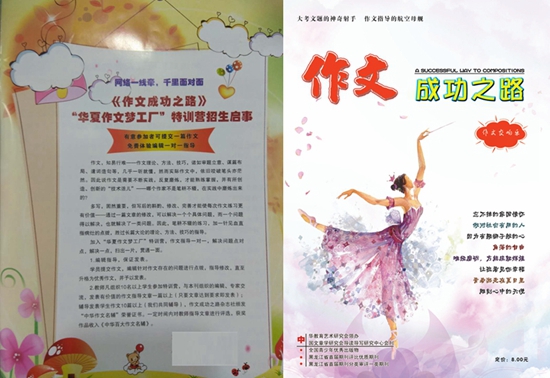 《作文成功之路》杂志是经国家新闻出版广电总局批准,由中华教育艺术研究会领办,黑龙江大庆教师进修学院主管、主办的作文教育教学类专业学术理论期刊,系“加拿大国际青少年教育家学术交流学会”重点推介汉语作文G4类教育期刊,“中国文章学研究导读导写研究中心会刊”,“黑龙江省首届期刊评比优质期刊”,“黑龙江省首届期刊分类审评一类期刊”。本刊国际标准刊号:ISSN 1001-571X,国内统一刊号:CN 23-1304/G4。高中版邮发代号:14-200,初中版邮发代号:14-338,小学版邮发代号:14-199。